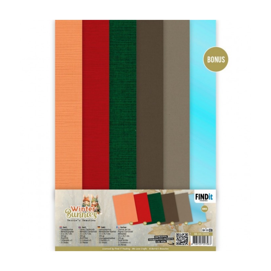 Linnenkarton pakket, passend bij de collectie Winter Bunnies. 20 vel + 1 bonus, 21 x 29.7 cm, 240 grams. Pakket bevat 5 kleuren x 4 vel: zachtoranje, rood, kerstgroen, chocoladebruin, mokka, bonus: Metallic Sky Blue