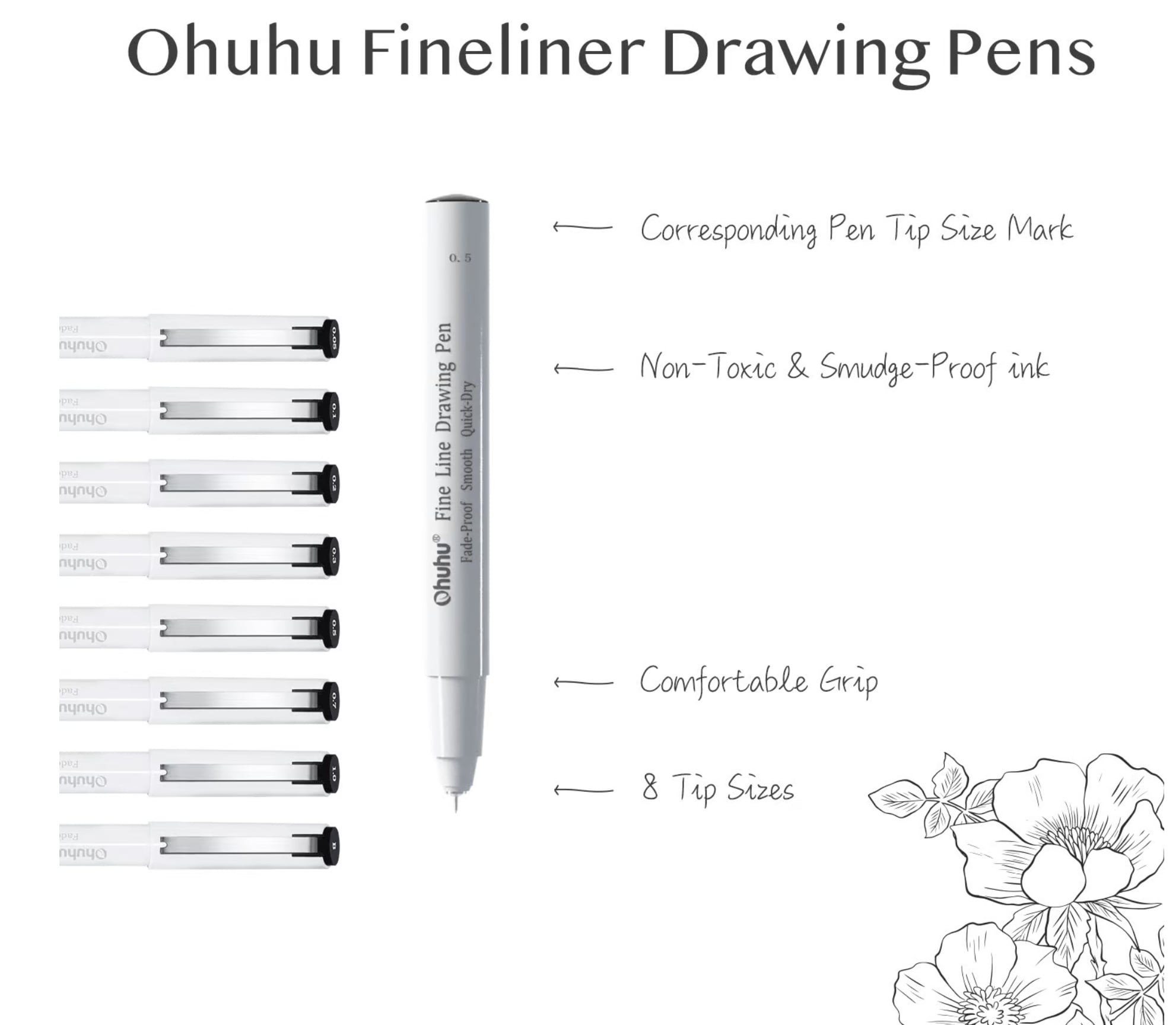 Ohuhu Fineliner drawing pen zwart – set van 8
